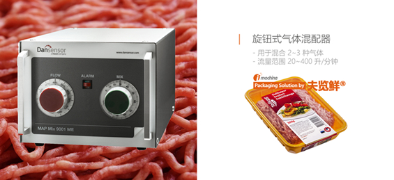 很多人认为肉有红色时看起来更新鲜。红色来自肉中的肌红蛋白,当在包装中使用高浓度氧气时保持红色。但氧气也会使好氧细菌生长,从而缩短肉类的保质期。二氧化碳可以阻止好氧细菌。因此,在氧气(80%)和二氧化碳(20%)之间取得平衡,红肉的保质期将增加400-500%【气体混配器】